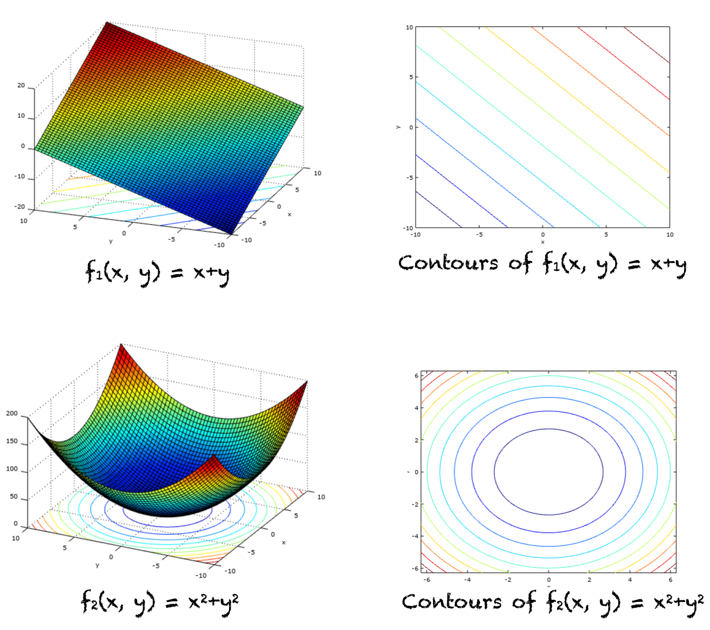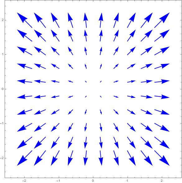 f[x_, y_] := x^2 + y^2 gradient[x_, y_] := {2x, 2y} Show[ Plot3D[f[x, y], {x, -2, 2}, {y, -2, 2}, PlotRange -> {0, 8}, AxesLabel -> {"x", "y", "f(x, y)"}, MeshFunctions -> {#3 &}, MeshStyle -> {{Thick, Red}}, Lighting -> "Neutral"], VectorPlot[gradient[x, y], {x, -2, 2}, {y, -2, 2}, VectorStyle -> {{Thick, Blue}}, VectorPoints -> 10] ]